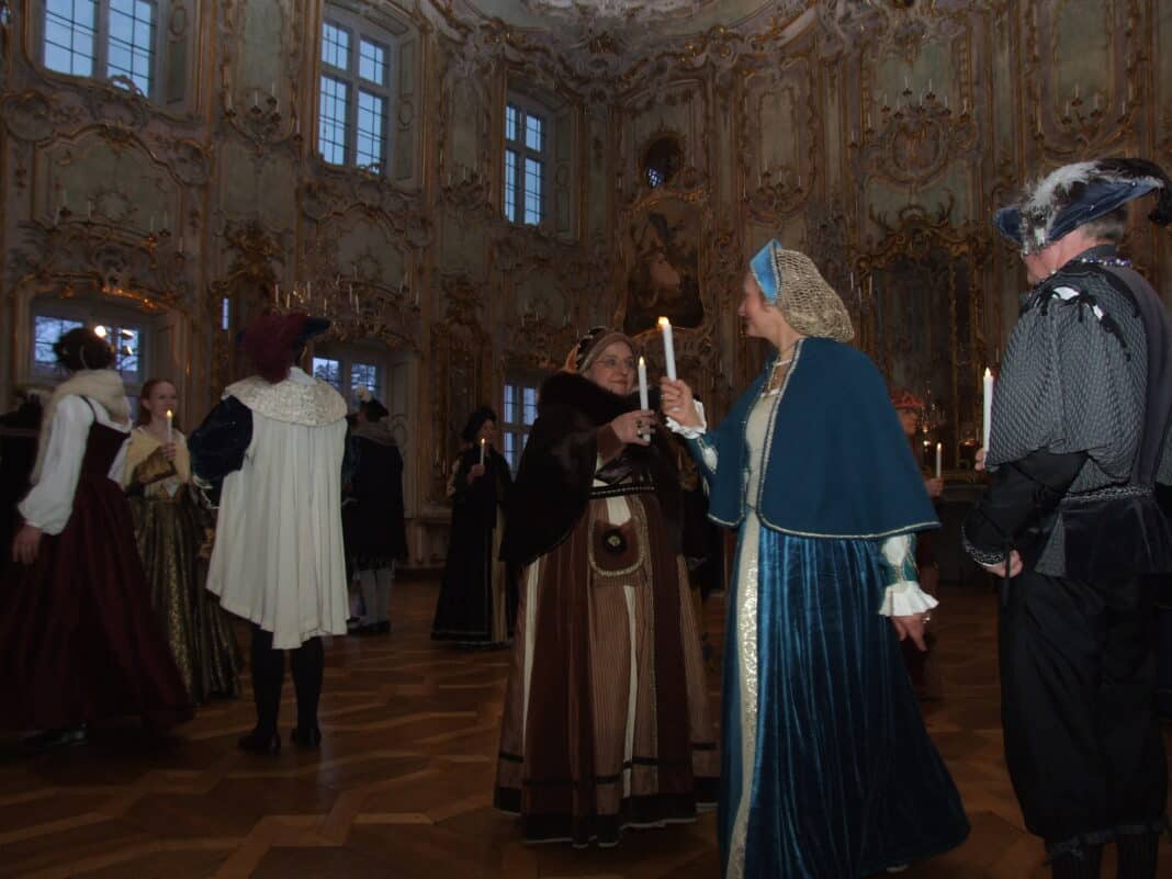 „Wintermärchen“ nannte sich eine Veranstaltung, mit der der Verein „Augsburger Geschlechtertanz“ sich und sein Tun an zwei Tagen im Schaezlerpalais präsentierte. Zahlreiche Interessierte nutzen die Gelegenheit, Aufführungen von Aschenputtel anzusehen sowie am Tanzworkshop zu beteiligen oder an historischen Tänzen mitzuwirken. Den Abschluss des Tages bildeten jeweils stimmungsvolle Lichtertänze im tatsächlich fast winterlichen kühlen Rokokosaal, wo allein die Kerzen in den Händen die Tänzerinnen und Tänzer für etwas Licht sorgten.