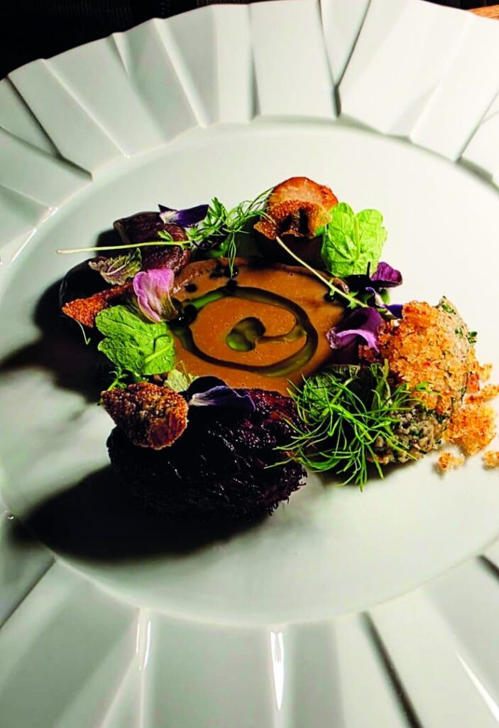 Seine Gäste zu überraschen ist vielleicht die übergeordnete Devise, nach der er gehobene, technisch aufwendige europäische Küche mit einem Twist vietnamesischen Funk kombiniert. Voller Finesse war auch der „simple Brotgang“ zwischendurch: das auf dem Holzkohlegrill geflammte Pita-Brot – sensationell! Weitere spektakuläre Kostproben seines Könnens lieferten unter anderem die Kombinationen „Löwenmähne, Kräutersaitling, Shiitake, Szechuanpfeffer“ (26,- €) oder „Carnaroli, Porree, Chinakohl, Champignon“ (20,- €). Die zarten Entenfilets (34,- €) mit rehydrierten Cranberries, Rotkohl Mousse und Umami versprühender Hoisin-Sauce zeigten nochmals, wie viele Geschmacksnuancen harmonisch und ästhetisch perfekt angerichtet auf einen Teller passen.