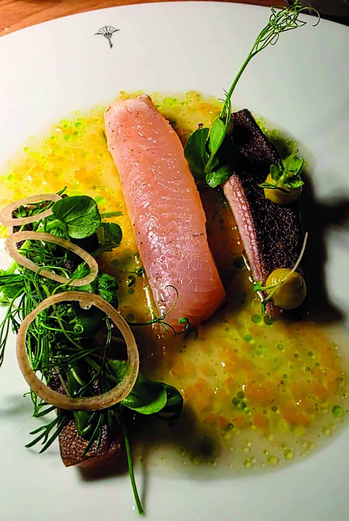 Das Sharing Konzept der Karte macht großen Genuss ganz unkompliziert. Es darf nach Herzenslust aus den verschiedenen Gängen gewählt, gerne auch geteilt werden. Ein strenges Menükorsett wird hier keinem Gast aufgezwängt. Los ging´s mit diversen Gruß-Botschaften aus der Küche – etwa einer Enten-Consommée, Tartelette mit Kürbismousse und Schnittlauchcreme, Miso-Tofu-Butter – die das Geschmacksfeuerwerk zündeten. Schon einer der ersten Gänge – Bachsaibling in drei Variationen mit fermentierter Steckrübenvinaigrette (19,- €) – ließ ahnen, mit wie viel Hingabe, Experimentierfreudigkeit und Präzision Huy Nguyen hier ein Aromenpuzzle zusammensetzt, das ein verblüffendes Gesamtbild ergibt.