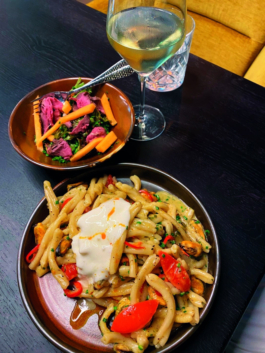 Als unkomplizierten Essensbegleiter wählten wir den lebhaften Sauvignon Blanc vom Pfälzer Winzer Uli Metger (Glas 0,2l zu 6,50 €) – passt eigentlich zu fast jedem Anlass und zum beschwingt-lockeren Lunch allemal.