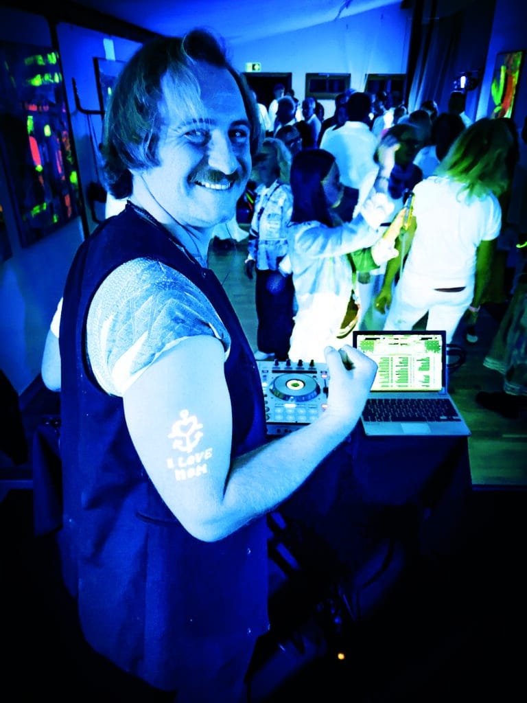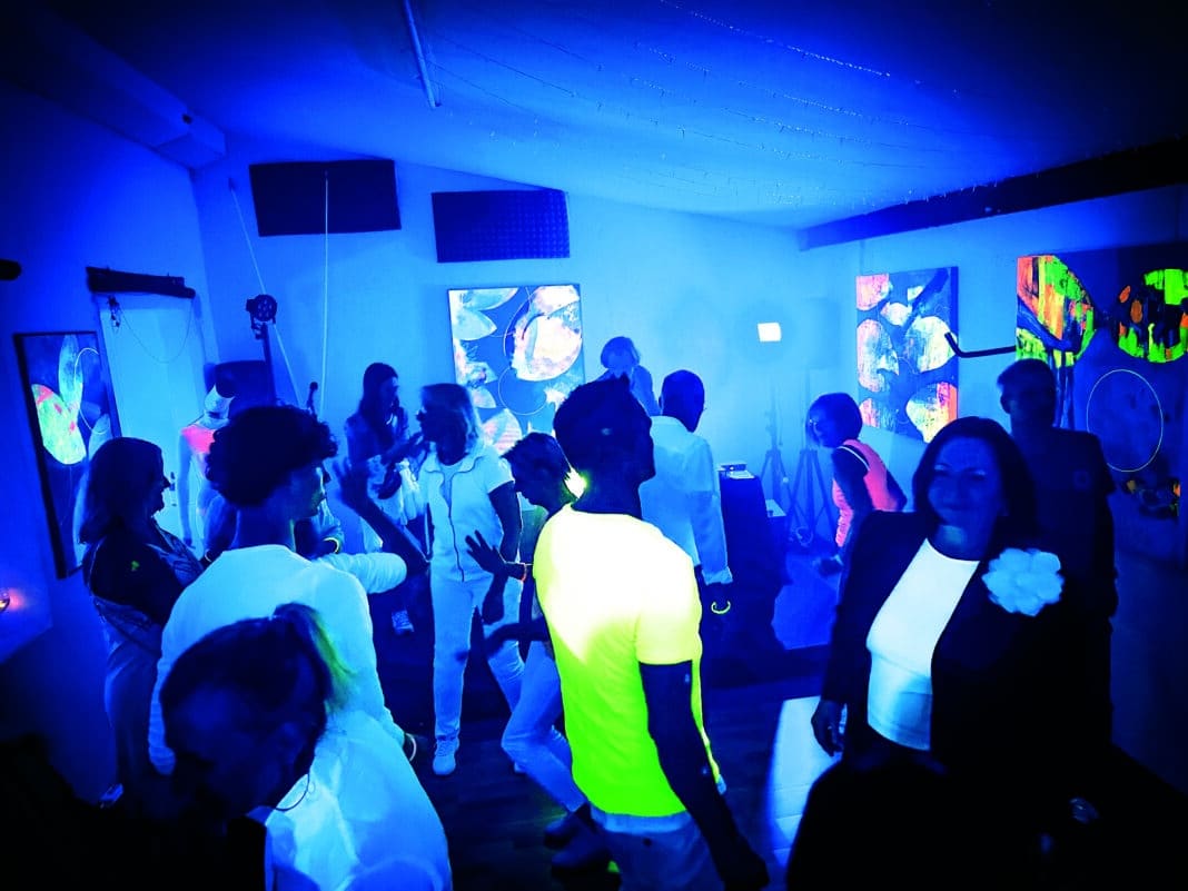 Ausgelassen Feiern war freilich dennoch die Devise, im kunstvoll-leuchtenden Ambiente. Inmitten der Bilder, die dank Neonlicht fast dreidimensional wirkten, ließen sich die Gäste im passenden weiß/neon-Dresscode auch nicht lange bitten und verwandelten die Tanzfläche zum coolen DJ-Sound in ein leuchtendes Farbenmeer.