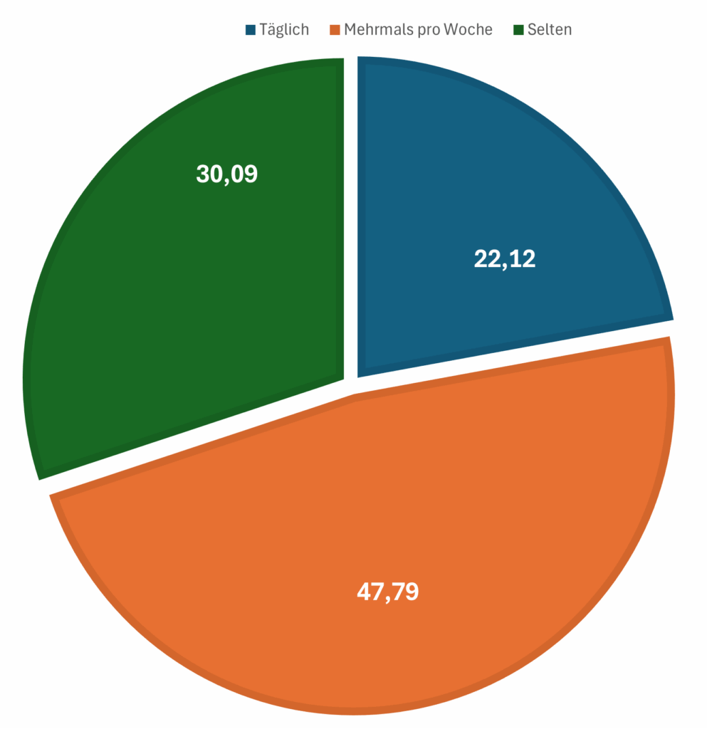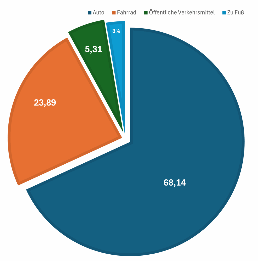 Von unseren insgesamt 113 Teilnehmern fahren 79 die Strecke täglich oder mehrmals pro Woche. Das mit Abstand am meisten genutzte Fortbewegungsmittel ist das Auto. Nur 36 Teilnehmer befahren den Bereich mit den Öffentlichen Verkehrsmitteln, dem Fahrrad oder laufen zu Fuß.